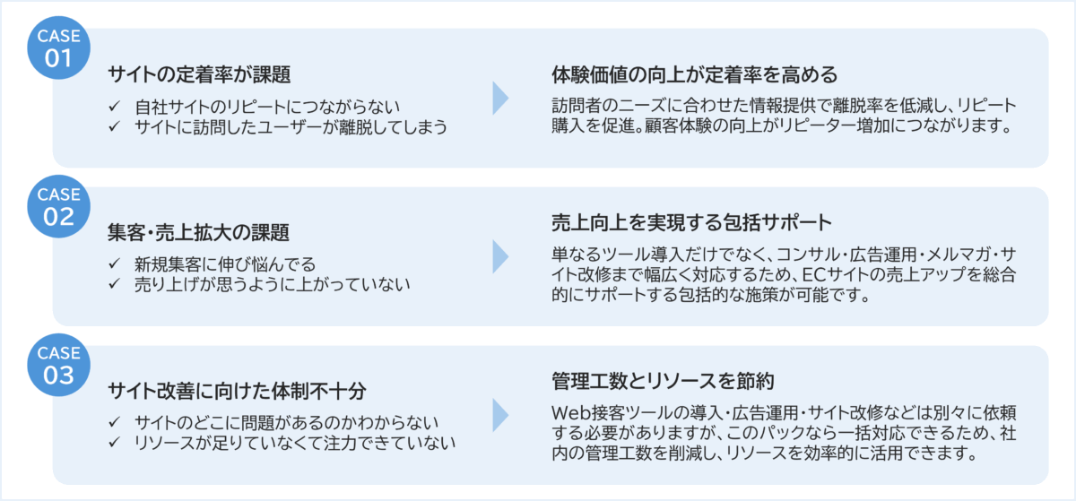 “ECラク盛りパック”とは、Web接客ツール【Flipdesk】を組み込んで顧客体験を最大化し、売上向上を実現するEC運用支援プランです。