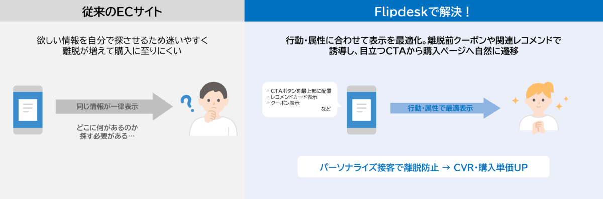 Flipdeskはユーザー属性や行動履歴をもとに、最適な情報を表示し、購入導線へとスムーズに誘導するWeb接客ツールです。
